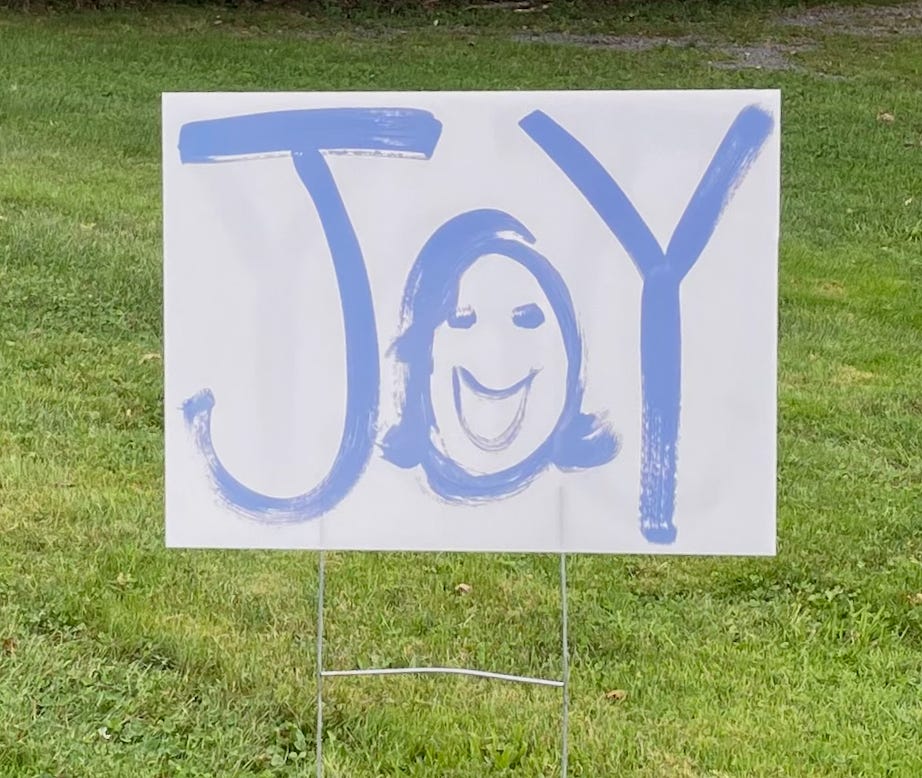 I’m mesmerized by the “Joy” sign below. In showing it to others, some instantly love it. Some say, “Hey, I’m not sure what it’s is about?” But that’s the point. It starts conversations. It’s not polarizing, unlikely to be vandalized. It sparks curiosity, and invites possibility. If you’re vexed by its ambiguity, you can append your own mini-sign, like “Vote November 5th!”