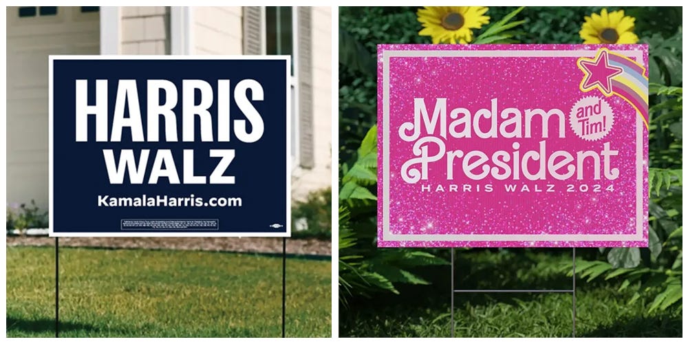 The eruption of enthusiasm for Kamala Harris sets the stage for a Democratic Party yard-sign rally. There’s the yawner below from the campaign’s official store. Or an independent group offers the Barbie look. Honestly, neither does it for me.